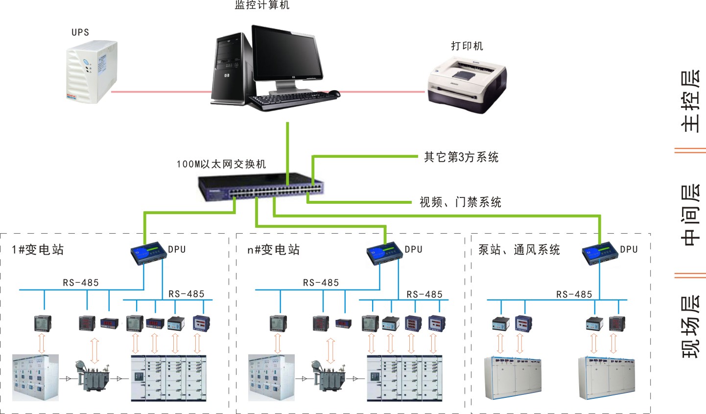 现场层:由电能质量分析仪、多功能测控仪、关口电度表等组成,进行各种数据的实时检测、记录。