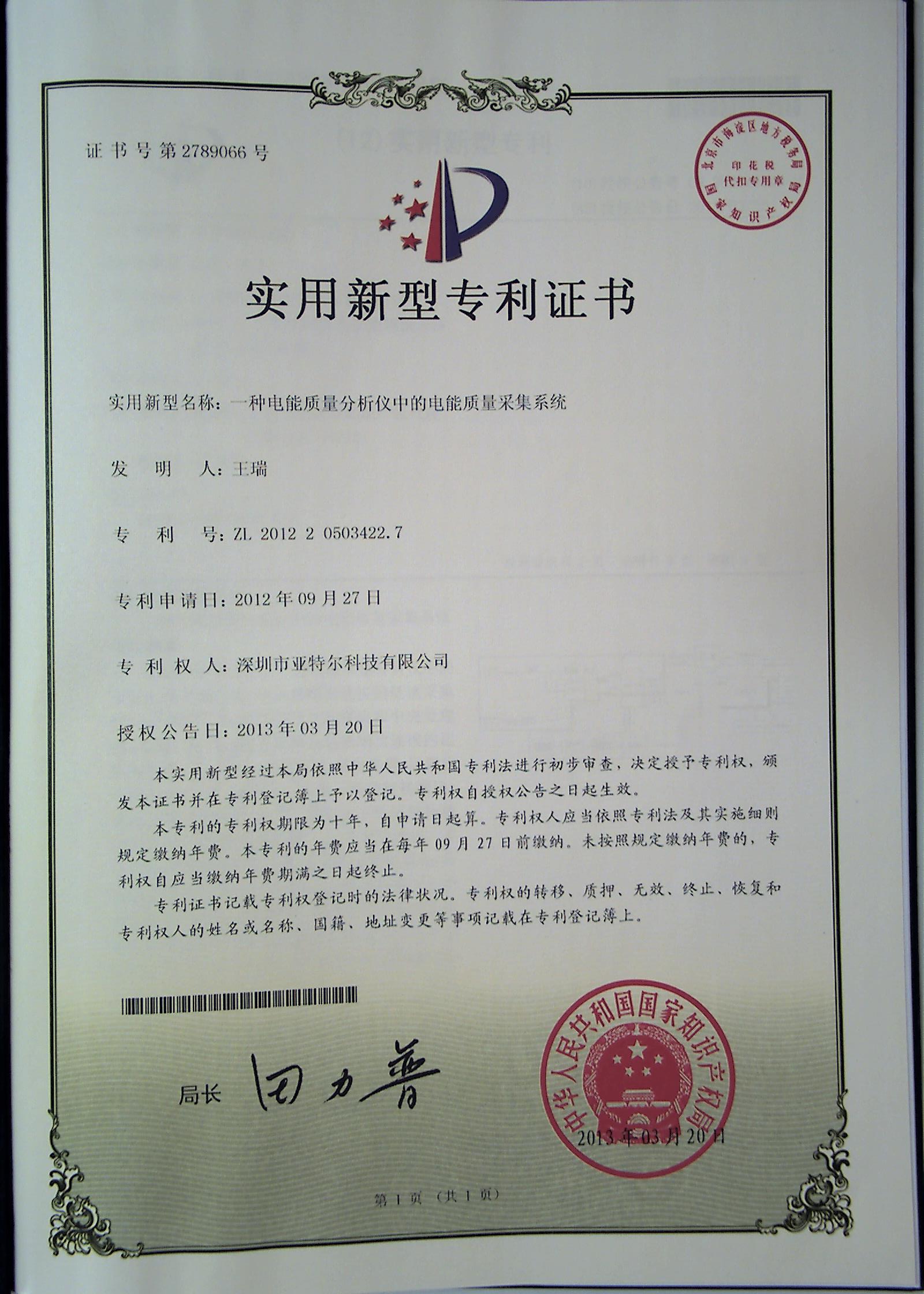 日前,公司连续接到国家知识产权局《实用新型专利证书》,我公司申报的“一种电能质量分析仪中的电能质量采集系统”和“一种电测仪表通用检定装置中的自检系统”分别获得国家知识产权局实用新型专利证书,这标志着公司产品的技术水平和技术进步工作达到了新的高度。